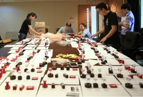 林某丽和R公司会计到场后,专案组按程序现场对有关封存资料拆封。经过统计,里面包括银行U盾37个、空白的江苏省增值税专用发票记账联4份、企业公章及发票专用章75套共计265枚。经过确认,其中部分公章系伪造,比如某知名汽车股份有限公司的公章及其法定代表人签字章、台州市多家大型企业的公章等,这些伪造印章涉及浙江、江苏、安徽等地企业43家。