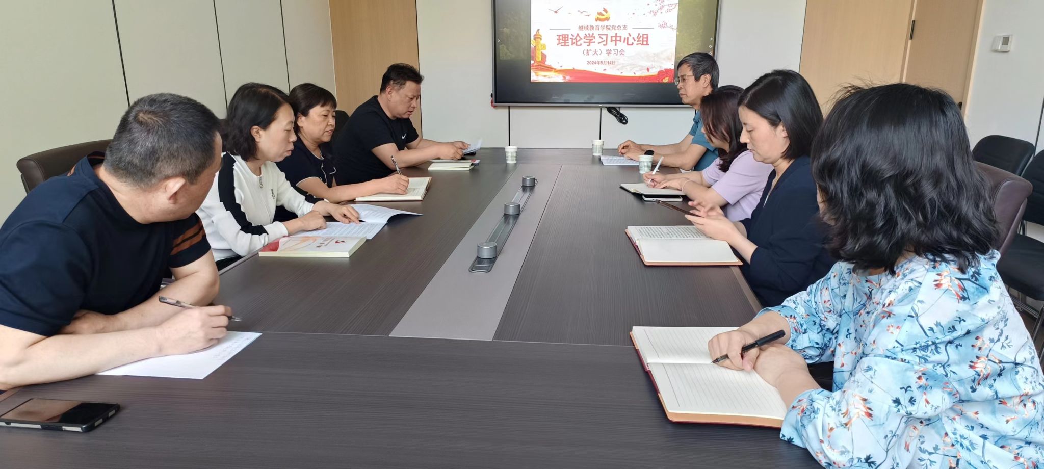 5月14日,继续教育学院党总支理论学习中心组扩大学习会在实训楼小会议室召开,继续教育学院全体党员参加学习。校党委委员、副校长冯东元,人力资源部唐慧君列席旁听。