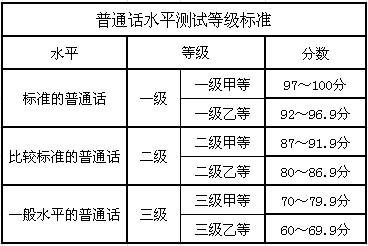 普通话水平等级分为一、二、三级,共三个级别,每个级别划分甲、乙两个等次。