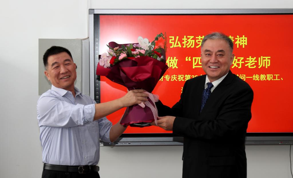 9月10日下午,校党委副书记、校长赵丽生,校党委委员、副校长李赟鹏,校党委委员、会校校长李富堂,人事处处长马红峰一行深入我院开展“庆祝第35个教师节慰问一线教职工、送奖下基层”活动。活动由校党委委员、副校长李赟鹏主持。
