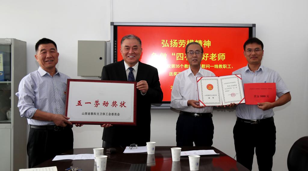 活动中,校党委委员、会校校长李富堂宣读了《关于表彰山西省教科文卫体系统五一劳动奖状五一劳动奖章和工人先锋号的决定》,根据表彰决定,全省共有太原师范学院等10个单位荣获山西省教科文卫体系统“五一劳动奖状”,我院位列其中。随后,校领导为我院颁发了荣誉奖牌、证书和奖金,并送上鲜花表示祝福。
