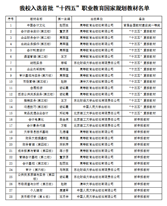 近日,教育部发布了《关于拟入选首批“十四五”职业教育国家规划教材名单的公示》。经单位申报、形式审查、专项审核、网络和会议评审、专家复核等程序,共有7262种教材拟入选首批“十四五”职业教育国家规划教材。我院教师李瑶、宋秋萍主编的教材成功入选。