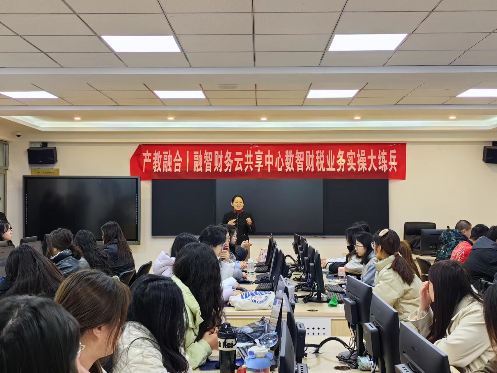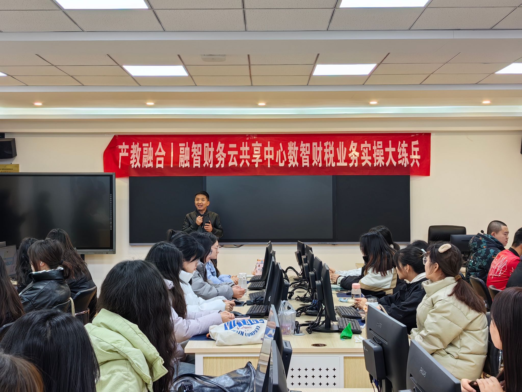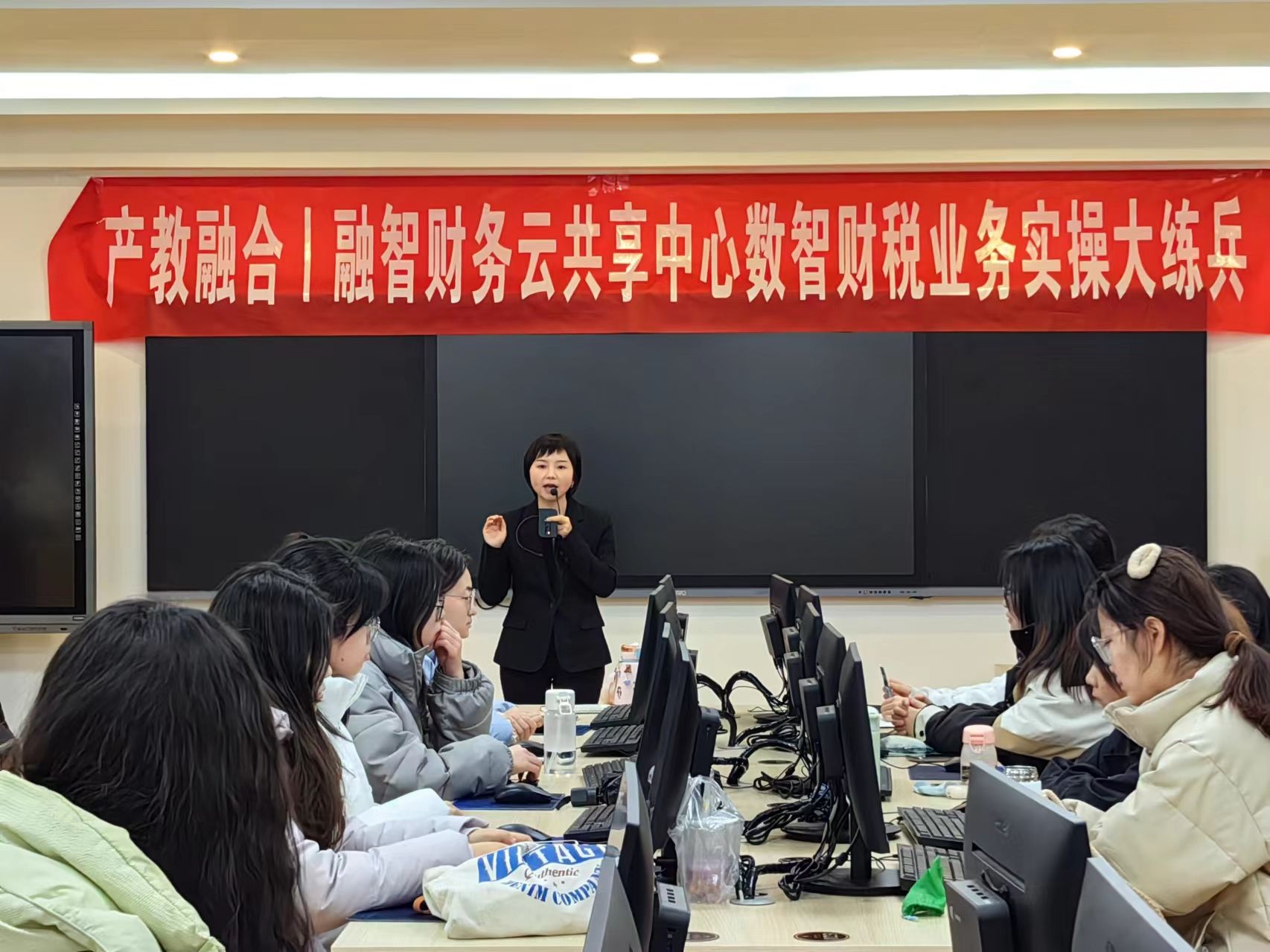 仪式上,涂盛琴向参加大练兵的2022级财税大数据应用三班的同学们介绍了融智财务云共享中心的产教融合实践教学模式。张明珠指出,纸上得来终觉浅,绝知此事要躬行,企业“实际业务+智能化平台+智能财税+企业老师带教”的实践教学模式是打通大学生就业“最后一公里”的重要途径。她希望同学们通过接触智能化操作系统平台,掌握一线企业动态账务,真正做到理论与实操相结合,获得更多的职业技能提升。