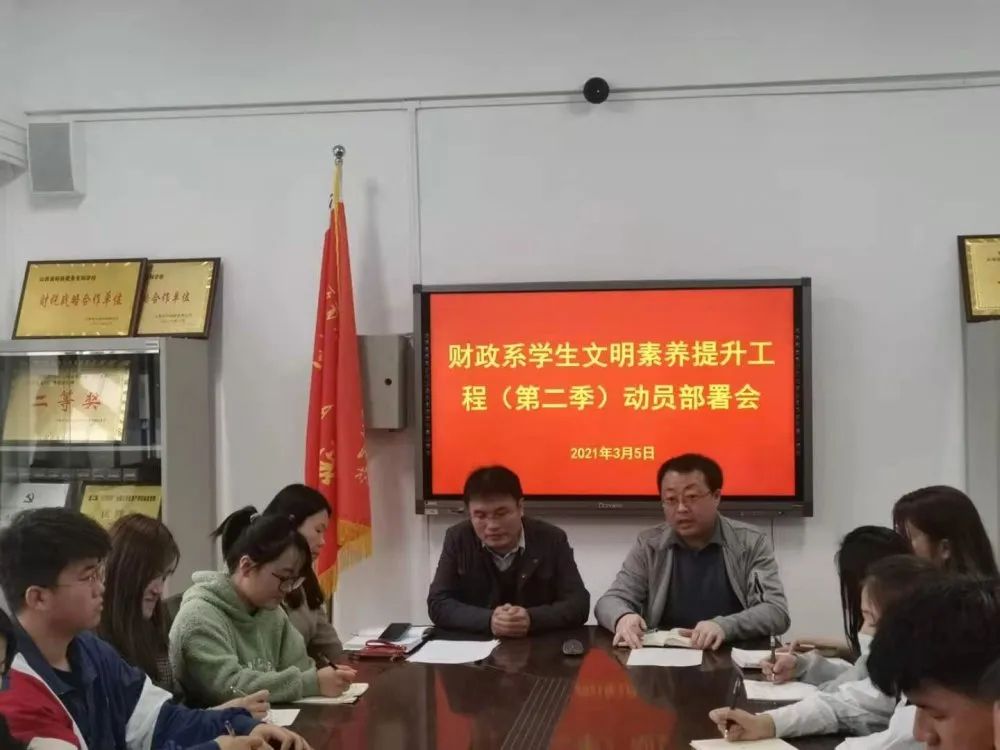 为践行社会主义核心价值观,提高财政学子文明素养。3月5日下午,财政系在330会议室召开了“财政学子文明素养提升工程(第二季)动员部署会”。系党总支书记庄东军、副书记张中元、分团委书记宋莉出席会议,分团委、学生分会主要学生干部及2019级、2020级各班团支书、班长参加本次会议。会议由分团委书记宋莉主持。
