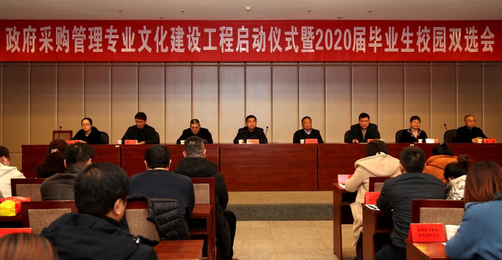 12月13日下午,我院在1号教学楼七层会议室举办了政府采购管理专业文化建设工程启动仪式暨2020届毕业生校园双选会。校党委委员、副校长李赟鹏,我院政府采购管理专业客座教授、原山西省省级政府采购中心副主任王跃进,就业指导中心主任田莉,校企合作办公室主任孙志勇,院长张炳君,党总支书记庄东军,副院长赵凯、张明珠等参加了会议。来自学院2017、2018、2019级政府采购管理专业学生及部分2020届毕业生参加了会议。会议由学院党总支书记庄东军主持。