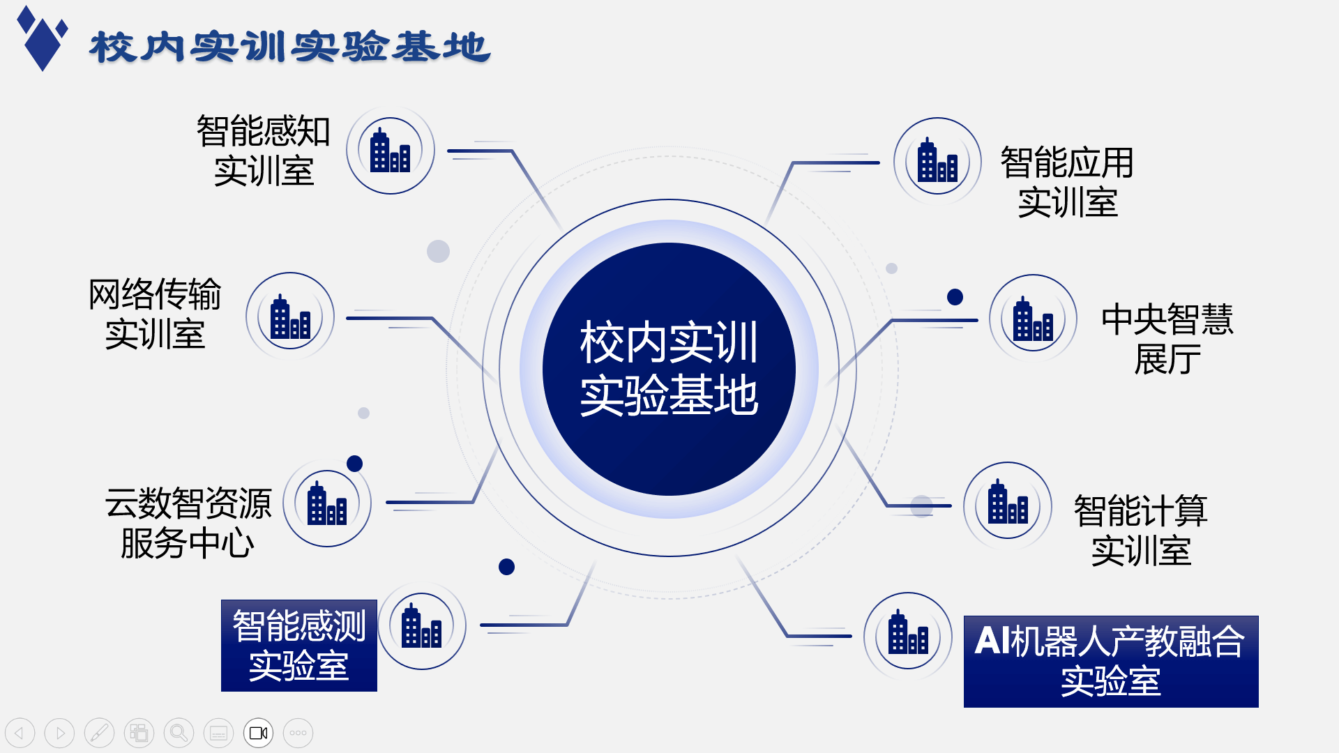 数智技术服务港总投资约1778万元,占地面积约2328平米。根据“数据采集、数据传输、数据存储、数据计算、数据可视化及数据应用”的技术主线,采取“感、传、存、算、视、用”一线贯通的方式,各实训模块前后递进,设计了智能感知实训室、网络传输实训室、云数智资源服务中心、智能计算实训室、中央智慧展厅、创新应用实训室七大实训区域,构建成开放多元、体系完备、功能集成、虚实一体的生产性综合实训基地。