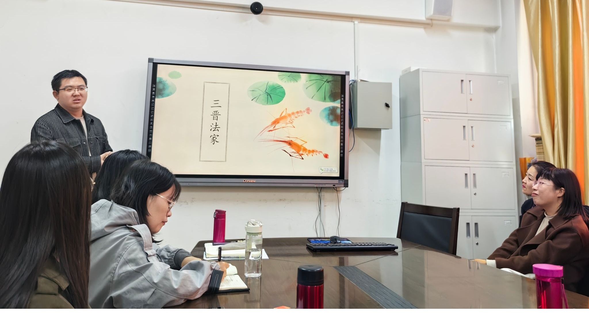 活动中,主讲教师王柏林以“三晋法家思想”为主题,通过梳理春秋战国时期礼崩乐坏的时代背景、法家代表人物李悝、吴起、申不害、商鞅、韩非子等法家学派的思想演变,重点阐释了法家富国、强兵、治民、贵君的理论建构与实现途径,揭示了法家思想在中华文明演进史上的重要作用,同时深入探讨了如何将这些中华优秀优秀传统文化思想资源融入课程思政,引导学生树立法治意识,培养创新精神。讲解结束后,全体教师围绕本次教学研讨主题进行充分交流,并对备课思路、课件制作及课程思政等问题展开了深入讨论,大家纷纷表示获益匪浅。