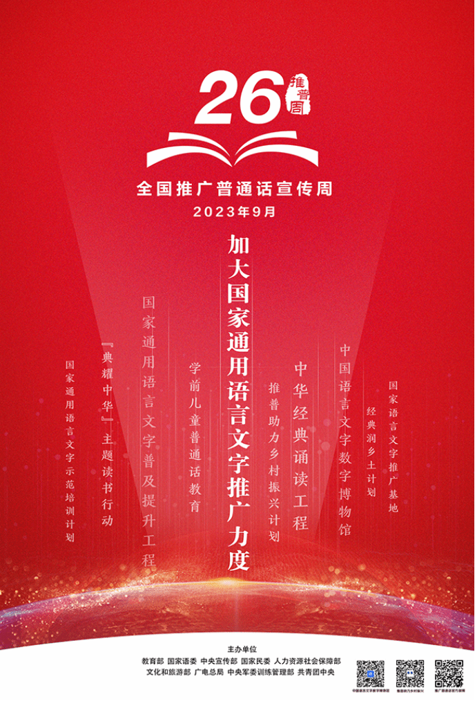 经国务院批准,自1998年起,每年9月第三周为全国推广普通话宣传周(简称推普周)。今年是第26届推普周,主题为“推广普通话,奋进新征程”。