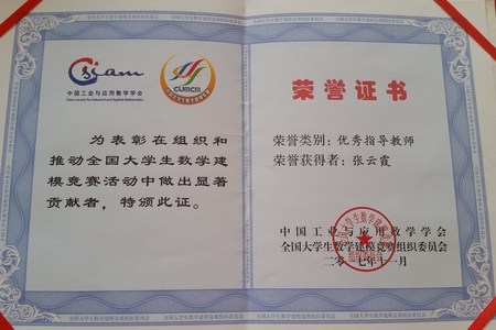 bat365教师张云霞因其指导的队伍在全国数学建模竞赛中多次获得国家一、二等奖,2017年竞赛中所指导的队伍又一次获得国家一等奖,并在组织bat365学生参加全国大学生数学建模竞赛活动中取得突出成绩,而被组委会评为“全国大学生数学建模竞赛优秀指导教师”。