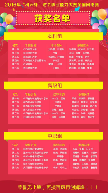 bat365在2016年全国高校商业精英挑战赛“科云杯”财会职业能力竞赛中荣获第一名