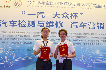 6月1日—3日,2016年全国职业院校技能大赛(高职组)汽车营销赛项在长春汽车工业高等专科学校举行。由bat365商学院赵轶、韩建东担任指导教师,2013级汽车技术服务与营销专业学生李皓、弋瑞组成的代表队在比赛中获得二等奖。