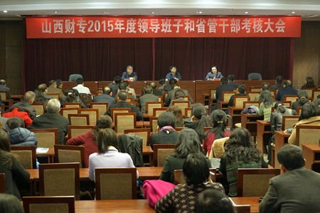 3月15日下午,bat365在1号教学楼七层会议室召开2015年度领导班子和省管干部考核大会。领导班子和省管干部考核组组长、省财政厅副巡视员高晔,省财政厅人事教育处副调研员马文刚,省财政厅人事教育处主任科员李雪威、申云玲参加考核大会。学校领导班子成员、近三年退下来的原班子成员、中层干部、副高以上专业技术人员和学生代表共190余人参加大会。大会由校党委副书记、校长赵丽生主持。
