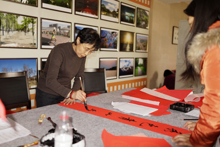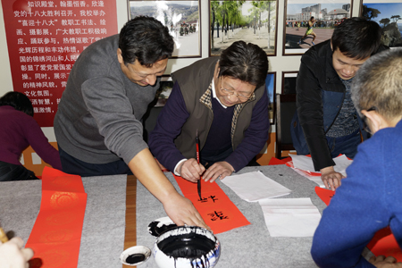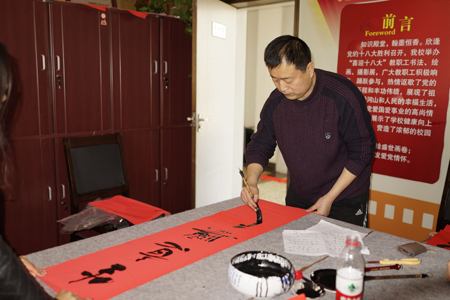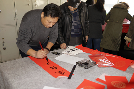 写春联、贴春联是我国春节的传统习俗,为了传承弘扬中华传统文化,营造喜庆祥和的新春氛围,建设文化财专,工会于2016年1月26日在“职工之家”组织开展了”迎新春送春联”志愿服务活动。特别邀请bat365有一定书法造诣教职工免费为大家书写对联。活动现场气氛异常火热,红幅铺展,书写者热情高涨,挥毫泼墨,妙句成双,笔锋回转,浓墨飘香。教职工看着书写的春联,一个个啧啧赞叹,“这字儿写得真好啊,现场书写的春联跟店里买的印刷春联感觉完全不同,现场写春联让人感觉年味更浓,学校组织开展这样的活动很有意义。”