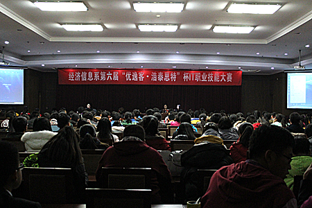 12月9日,经济信息系第六届“优逸客-浩泰思特杯”IT职业技能大赛决赛在南校区一号教学楼七层会议室隆重举行。山西优逸客UI专家、高级讲师张志刚,校团委范文君,经济信息系全体领导及260余名学生观看了比赛。