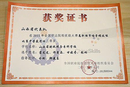 6月3日——6日,2015年全国职业院校技能大赛——高职组市场营销赛项在无锡商业职业技术学院举行。bat365贸易经济系由王方主任、杨莉娟副主任带队,由全盼、韩建东老师指导,选派2013级市场营销专业学生甘晓芬、张琳、许鑫淼、蒙龙龙组成的山西三队在比赛中获得了全国市场营销技能大赛三等奖。
