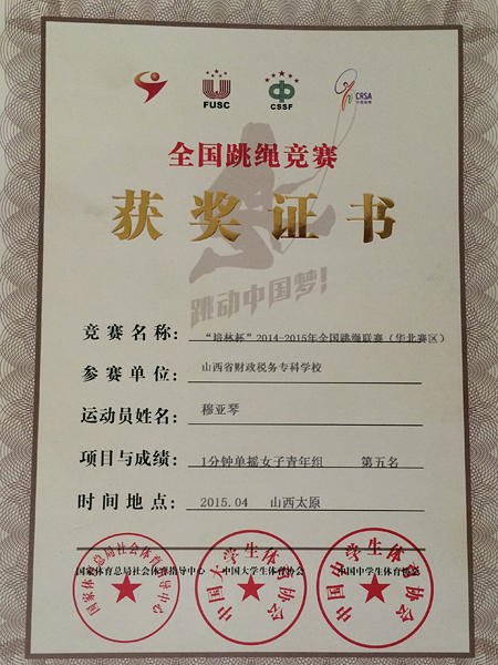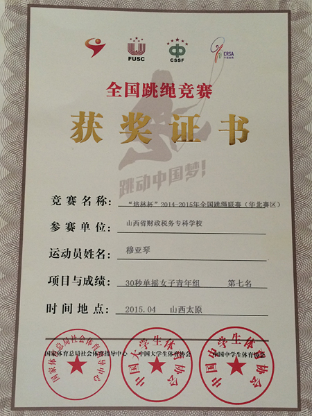 4月18、19日,“培林杯”2014—2015全国跳绳联赛华北赛区暨2015年山西省大、中、小学生跳绳比赛在山西财经大学举行。来自新疆、河北、山东、吉林等地区共65支代表队700余名运动员参加了此次比赛的角逐。bat365选派由穆亚琴、翟晓宇等6名同学组成的代表队参加了此次比赛,最终穆亚琴同学在1分钟单摇女子青年组、30秒单摇女子青年组两个单项的比赛中分别荣获第五名和第七名的好成绩,带队教练员任欣、董建国获得“优秀教练员”称号。