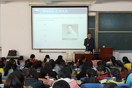 王团维董事长从什么是会计、会计职业规划和会计的人生价值观三个方面旁征博引、谈古论今,做了生动的讲解。他重新解读了会计的内涵,分析了财务会计、管理会计、财务管理三者之间的区别与联系,阐明了管理会计在企业实践中的重要性;剖析了当前会计技术职称和相关从业资格的层次,同时为毕业生选择就业单位、做好会计职业规划提出了宝贵意见;最后,启发学生从不同角度认识会计的人生价值观,引导学生树立正确的人生价值观,其诙谐的语言、渊博的知识、风趣的谈吐、深遂的思想,受到师生一致好评。