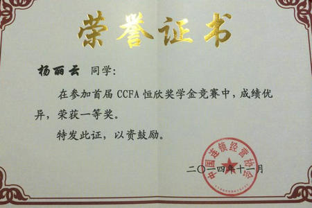 本次大赛由中国连锁经营协会、香港恒欣连锁教育基金会联合举办,全国总决赛分品类管理理论知识考核、线上品类管理3D仿真模拟操作、现场团队端头商品陈列和堆头创意陈列以及现场综合素质答辩四个部分,决赛中,杨丽云同学与来自全国20所本、专科院校的20名选手同场竞技,最终获得2014年CCFA恒欣奖学金全国决赛一等奖,获奖金10000元,入选中国连锁协会优秀人才储备库。