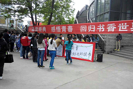 4月23日是世界读书日,校学生会、学生社团联合会、《超越》报社、大学生记者团、安琪儿文学社和读者协会在会堂前举办了“品读经典、感悟青春、回归书香世界”系列活动启动仪式。活动得到了广大学生的积极参与,纷纷在展板上签上了自己的名字,表示要珍惜现有的时间去品读好书,积累知识,开阔视野,为学习和工作打下良好的基础。