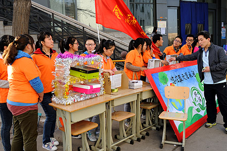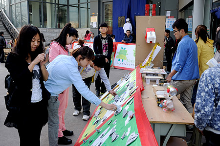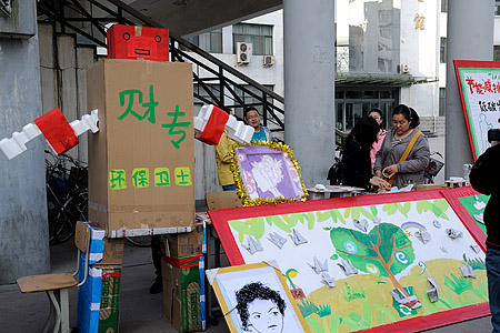 下午五点,青年广场熙熙攘攘。现场活动展板宣传的环保知识一目了然,多媒体展示的内容丰富多彩。废旧物品的回收改造更是吸引了广大师生,许多同学在现场咨询,并动手参与制作,体验DIY的乐趣。