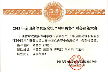 bat365在2013年全国高职院校“网中网杯”财务决策大赛中荣获特等奖