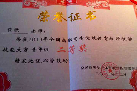 大赛有来自全国28个省、市、自治区270余名选手参加。比赛分为初赛、复赛和决赛,经过体能与急救、运动技术、教学设计、微课程作品四个指定专业项目的考核,bat365体育教学部任欣老师夺得了个人二等奖。