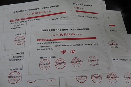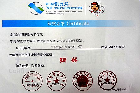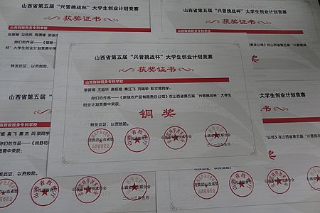 李皓明等同学的作品《山西御厨坊私房菜网络推广公司》、王旭华等同学的作品《新绿农产品有限责任公司》、王博威等同学的作品《尚舒坊有限责任公司》、苑瑶楠等同学的作品《银酷—Mini金融服务有限责任公司》、冯银娜等同学的作品《历酒弥新酒糟发展有限责任公司》、邹蓉等同学的作品《老北方玉米糊糊食品有限责任公司》共六件作品荣获山西省第五届“兴晋挑战杯”大学生创业计划竞赛铜奖。