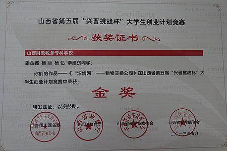张金鑫等同学的作品《“浓情网”—物物交换公司 》荣获山西省第五届“兴晋挑战杯”大学生创业计划竞赛金奖。