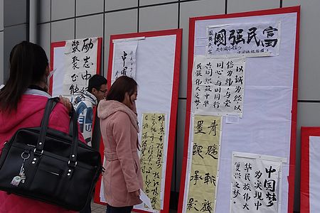 为选拔出学生作品中的优秀作品,10月28日下午,由校团委组织校学生会和社联在南校区青年广场举行了“励志中国梦-书法篆刻大赛”作品展览暨评选投票活动。