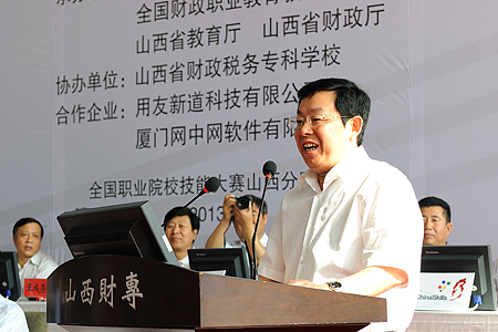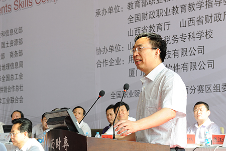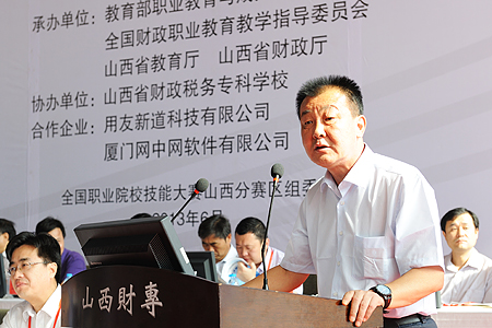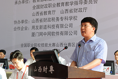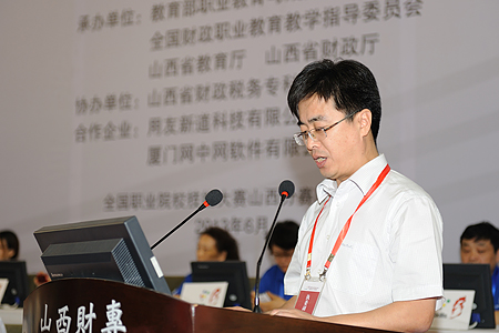 高职会计技能赛项开幕式由财政部干部教育中心副主任、全国财政职业教育教学指导委员会副主任委员王庆阁主持。来自主办单位、承办单位、协办单位、相关企业、团体的领导和各参赛队参加了开幕式。山西省财政厅常国华副厅长致欢迎辞,教育部职业教育与成人教育司葛道凯司长和全国财政职业教育教学指导委员会主任委员、财政部人事教育司张猛副司长分别讲话,合作企业用友新道科技有限公司郭延生总裁和厦门网中网软件有限公司张思达董事长分别致辞,高翠莲、王潞分别代表裁判员和参赛选手宣誓。山西省教育厅张文栋厅长宣布赛事正式开始。