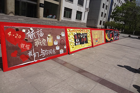 活动中,同学们一个接一个将祈愿蜡烛排在一起,用烛光拼成心形图案“4·20雅安”字样,并手捧祈愿蜡烛围成一个圆圈,闭上眼睛默默为雅安灾区人民祈祷一分钟。在音乐伴奏声中,广播站同学们朗诵了诗歌《雅安坚强》。随后,在场的同学们纷纷把写有祝福话语的小卡片张贴在祈福展板上,“加油!雅安!”、“雅安坚强,雅安平安”、“雅安加油,我们同在”等众多祝福话语表达了财专学子对雅安地震灾区同胞的深深祝福,大家共同祝愿雅安能够早日从灾难中走出,祝愿雅安的明天更加美好。