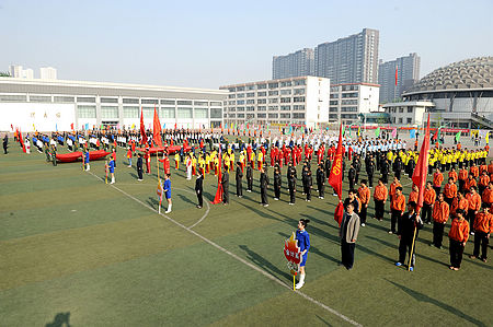 运动员裁判员入场后举行了庄严的升国旗仪式。随后全体师生肃立,为在“4.20”四川芦山地震中遇难的同胞默哀。