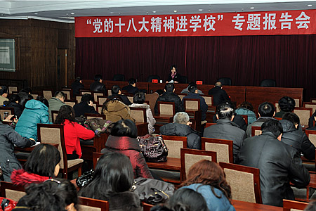 1月7日上午, bat365在实训楼七层会议室举行“党的十八大精神进学校”专题报告会,特邀党的十八大代表、山西师范大学博士生导师、科技处处长许小红教授作报告。