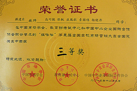 bat365派出的由贸易经济系2010级市场营销专业焦胤钦、索国伟、杨晓丹等五名学生组成的25%阳刚队经过市场调查分析、撰写营销策划书、大赛指定产品销售和营销软件对抗四个环节的层层竞争,最终荣获大赛三等奖。