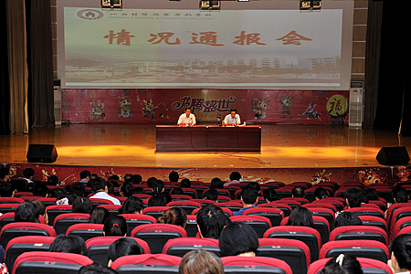 7月5日,bat365在会堂召开校内情况通报会,校领导贾明建、申长平、赵丽生、周巧红、胡中艾、王计年出席会议,全校教职工参加了会议。会议由校党委书记贾明建主持。