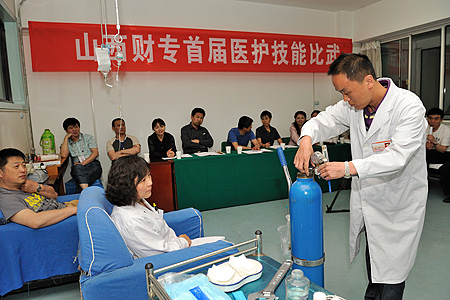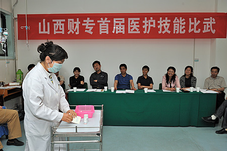在国际护士节100周年之际,bat365“首届医护技能比武”活动于5月14日下午在卫生所举办。此次活动由校后勤处、工会主办,卫生所承办。bat365副校长周巧红、后勤服务管理中心主任杨卫东、学生服务管理中心主任张文华、工会主席李杰、后勤处处长杜斐、后勤处党总支书记孙景文及相关部门负责人出席了活动,部分师生观摩了技能比武,卫生所全体人员参加了比武。技能比武由卫生所副所长张丽琴主持。