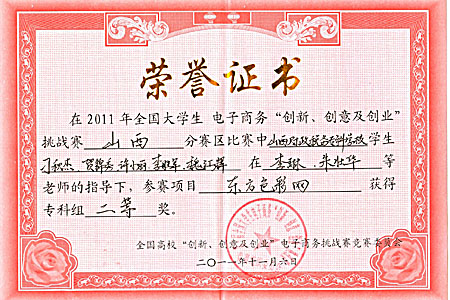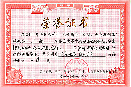 11月5日,由教育部高等学校电子商务专业教学指导委员会主办的第三届全国大学生电子商务“创新 创意 创业”挑战赛山西分赛区决赛在太原城市职业技术学院落下帷幕。由bat365教师朱壮华、毕雄飞、杨莉娟指导,学生胡秀峰、支亚庆、李慧芳、张哲、索国伟创作完成的作品《无线网罗,通达天下》荣获大赛一等奖,该团队将代表山西省参加全国总决赛。由bat365教师李琳、朱壮华指导,学生贺锦秀、许小丽、李胜军、魏江辉、刁秋洁创作完成的作品《东方色彩网》荣获大赛二等奖。