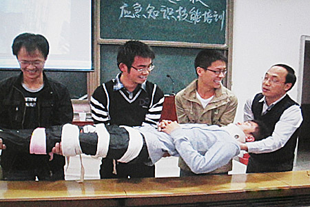 培训由太原市红十字会专家主持进行,主要讲解了心跳呼吸骤停抢救(心肺复苏)和创伤救护四项基本技能(止血、包扎、固定、搬运)的有关知识和实际操作方法。