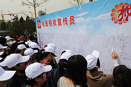 在全国第二十个税收宣传月活动之际,我系携手万柏林区国税局于4月20日在玉门河公园举行了“服务科学发展,共建和谐税收”的大型税收宣传暨“大学生税收实践”活动。万柏林区国税局领导、bat365副校长周巧红教授出席活动。万柏林区国税局全体员工及财政系师生、学生志愿者参加了本次活动。