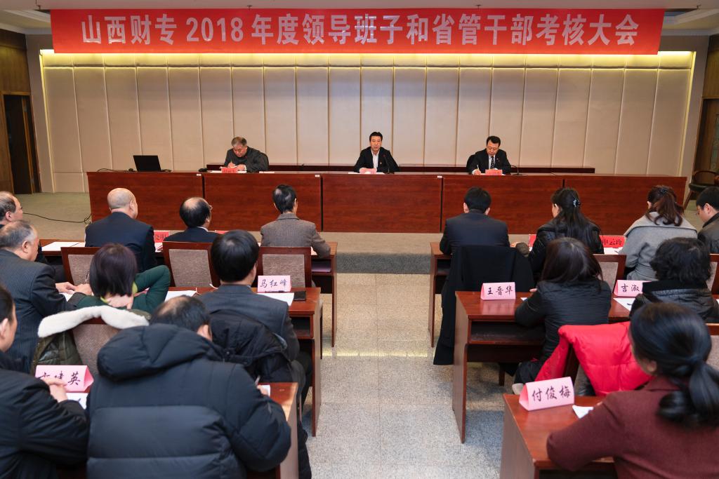 1月14日上午,bat365在1号教学楼七层会议室召开2018年度领导班子和省管干部考核大会。领导班子和省管干部考核组组长、省财政厅党组成员、副厅长黄庙,省财政厅人事教育处副处长马文刚、王梦贞、申云玲、魏雨社、陈佳璐参加考核大会。学校领导班子成员、中层干部、副高以上专业技术人员和学生代表共190余人参加考核大会。考核大会由党委副书记、校长赵丽生主持。