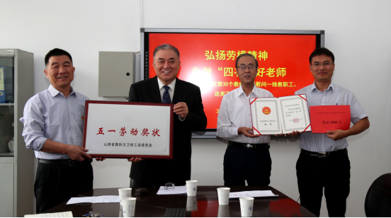 在旅游学院,杨晓明副书记一行为山西省教科文卫体系统五一劳动奖章获得者谢红霞教授颁发了奖章和证书,对谢红霞教授及团队取得的骄人成绩表示祝贺,希望大家坚守初心、勇担使命、争做时代好老师。