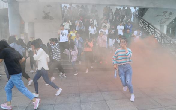 【场景二】:会堂周围发现烟雾,疑似出现火情,正在会堂参加新生安全知识讲座的新生以贴靠墙壁、用手捂住口鼻、低头弯腰的动作沿楼梯迅速疏散,用时不到6分钟,1700余名新生全部集合完毕。与此同时,各部门综治消防队员,火速赶到火情区域,在太原市万柏林应急救援大队兴华中队多名队员的指导下,使用灭火器具对现场油盆、木材等多处火源进行扑灭。