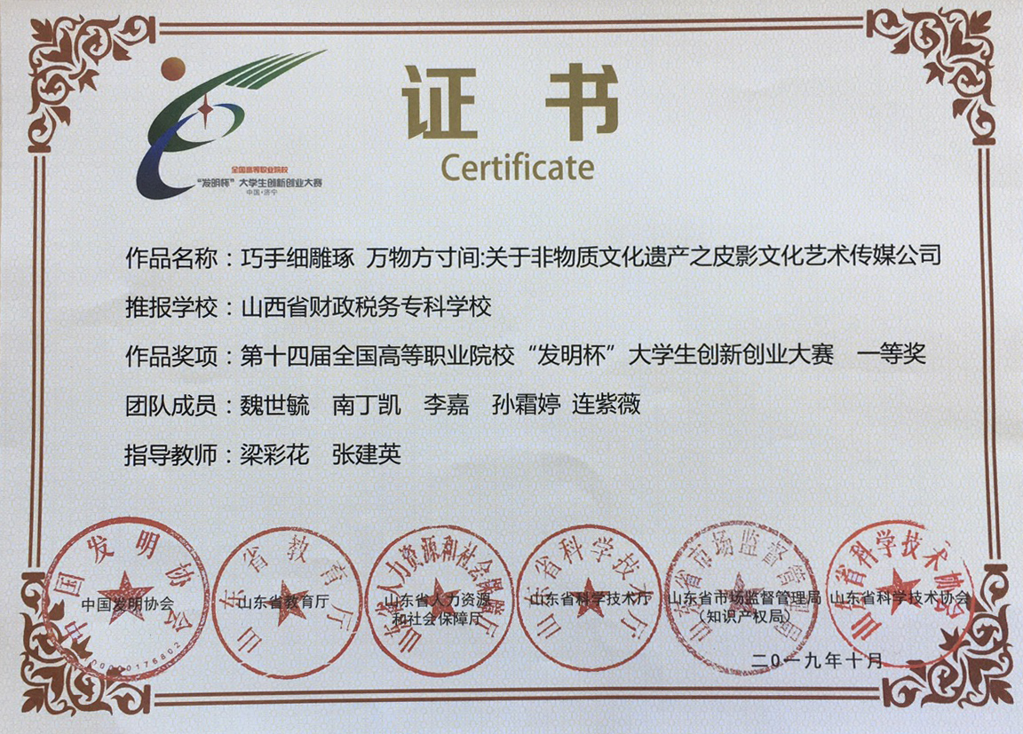 为积极响应党和国家“大众创业万众创新”的号召,全面提升bat365学生综合素质,提高学生科技创新能力,校团委积极打造科技文化品牌、搭建创新创业平台,依托大赛推荐优秀作品参加各级各类高校赛事。此次大赛,bat365作品《巧手细雕琢,万物方寸间——关于非物质文化遗产之皮影文化艺术传媒公司》、《一步一景,一景一韵,品历史,赏民俗——青龙古镇旅游文化推广方案》荣获大赛一等奖;梁彩花、张建英两位同志荣获大赛“优秀指导教师”称号。
