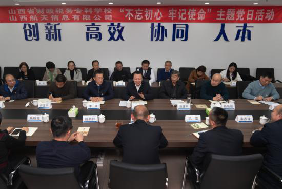 为深入贯彻落实十九届四中全会精神,进一步推动“不忘初心、牢记使命”主题教育往深里走、往实里走,扎实推进服务地方、服务基层、服务群众“三服务”工作, 11月29日下午机关党总支第一党支部、财税学院教师党支部、山西省航空信息有限公司共同举办了一场形式多样、内容丰富的党日活动,党委书记王新淮,党委副书记杨晓明,纪委书记、监察专员张俊平以普通党员身份参加党日活动,山西省航空信息有限公司总经理张益明,副总经理蔚鹏炜,副总经理李志锋等公司党员领导参加,活动邀请省总工会教科文卫体工会联合会常务副主席张建平同志,副主席尹玉平同志;山西省税务局纳税服务处副处长李峰同志参加。