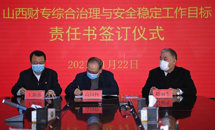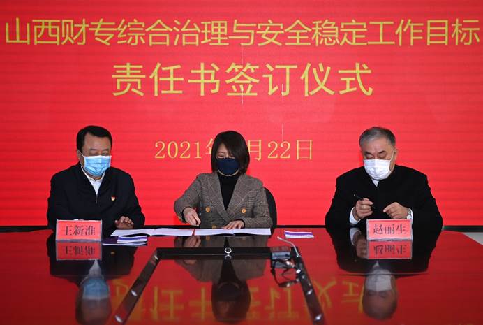 为进一步做好“平安校园”和“三零”单位创建,落实安全管理主体责任,1月22日上午,学校组织各党总支书记及部门负责人在第五会议室举行了2021年度综合治理与安全稳定目标责任书签订仪式,党委书记王新淮、校长赵丽生代表学校与10个党总支31个部门签订了《综合治理与安全稳定目标责任书》,要求各部门严格按照目标要求,履行安全管理主体责任,落实安全管理制度,强化全员安全教育,排查整治安全隐患,切实保障校园安全稳定,营造平安和谐教学环境,为学校“双高校”建设奠定了坚实基础。