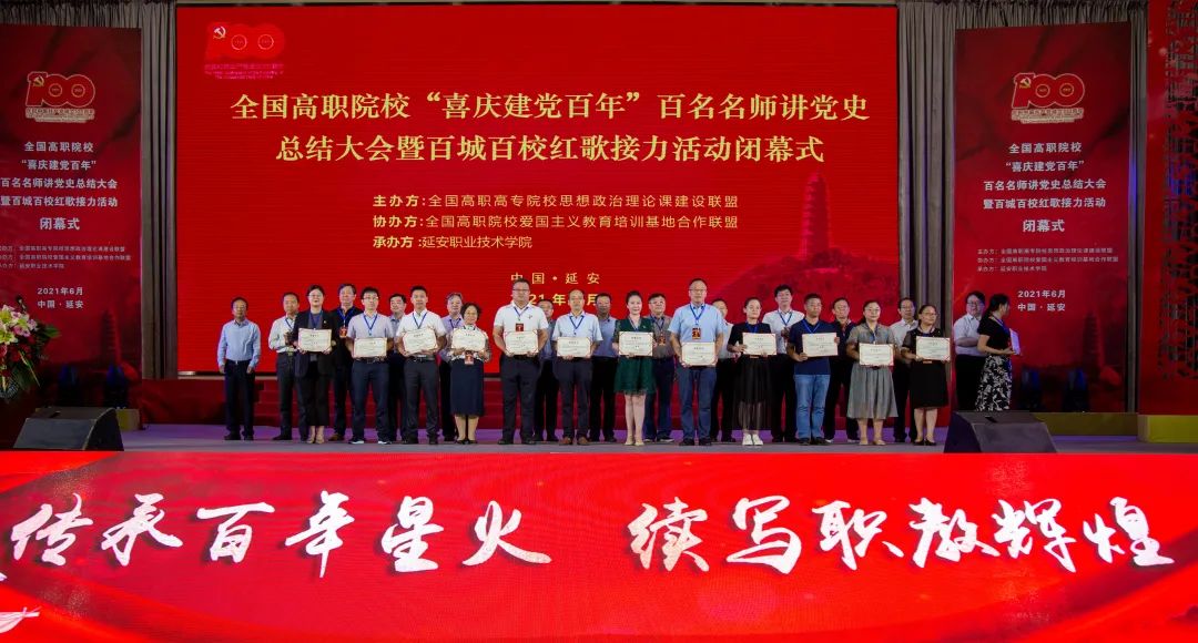 2021年6月19日,全国高职高专院校“百城百校百万师生喜迎建党100周年”红歌接力活动走进最后一站延安。在延安职业技术学院,百余所高职院校的党委书记、校长、思政课教师和大学生,聆听了延安职业技术学院老师所做的《延安精神8种原生形态》现场教学展示和延安干部学院专家所做的主题报告,交流了全国高职院校开展党史学习教育的经验,总结了“百名名师讲党史”活动和“百城百校百万师生喜迎建党100周年”红色歌曲接力活动开展情况,为获奖的名师和学校颁发了荣誉证书。bat365报送的《青春心向党 唱响新时代》红歌视频作品荣获一等奖。