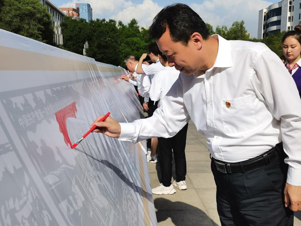 校党委委员为手绘活动开笔。近500名党员干部和师生兴致勃勃拿起画笔蘸取红色颜料在绘板上悉心描绘。从五四运动、中国共产党第一次代表大会到遵义会议,从长征大会师、延安精神永放光芒到建立全国抗日统一战线,从中国人民政治协商会议第一届全体会议、开国大典到成功研制“两弹一星”,从扩大对外开放、香港澳门回归到实现载人航天,从党的十八大十九大召开、到“五位一体”总体布局、中国梦、“一带一路”倡议,从打赢全民抗“疫”阻击战、脱贫攻坚目标任务圆满完成到全面建成小康社会,绘板全面展示了中国共产党从播下革命火种的小小红船,到成为领航复兴伟业的巍巍巨轮,在100年进程中,坚守初心和使命,团结带领中国人民应对危局困境、经受风险考验、战胜困难挫折、开创民族复兴伟业,取得举世瞩目辉煌成就的历史画卷。一幅幅画面生动真实、感人致深。大家边描绘边回忆交流,每一次落笔都郑重而饱含真情,绘出了广大财专人爱党爱国爱社会主义的浓浓情意。