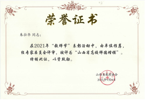 9月8日,山西省教授协会召开了庆祝教师节暨科技成果展示与转化平台启动发布会,经各单位严格遴选和推荐,山西省教授协会组织专家严格评审,决定对19个集体和144名个人进行表彰并作为科技成果展示对象。bat365会计学院副院长郑红梅副教授被授予“山西省高校教学名师”,信息学院副院长朱壮华副教授被授予“山西省高校师德楷模”。