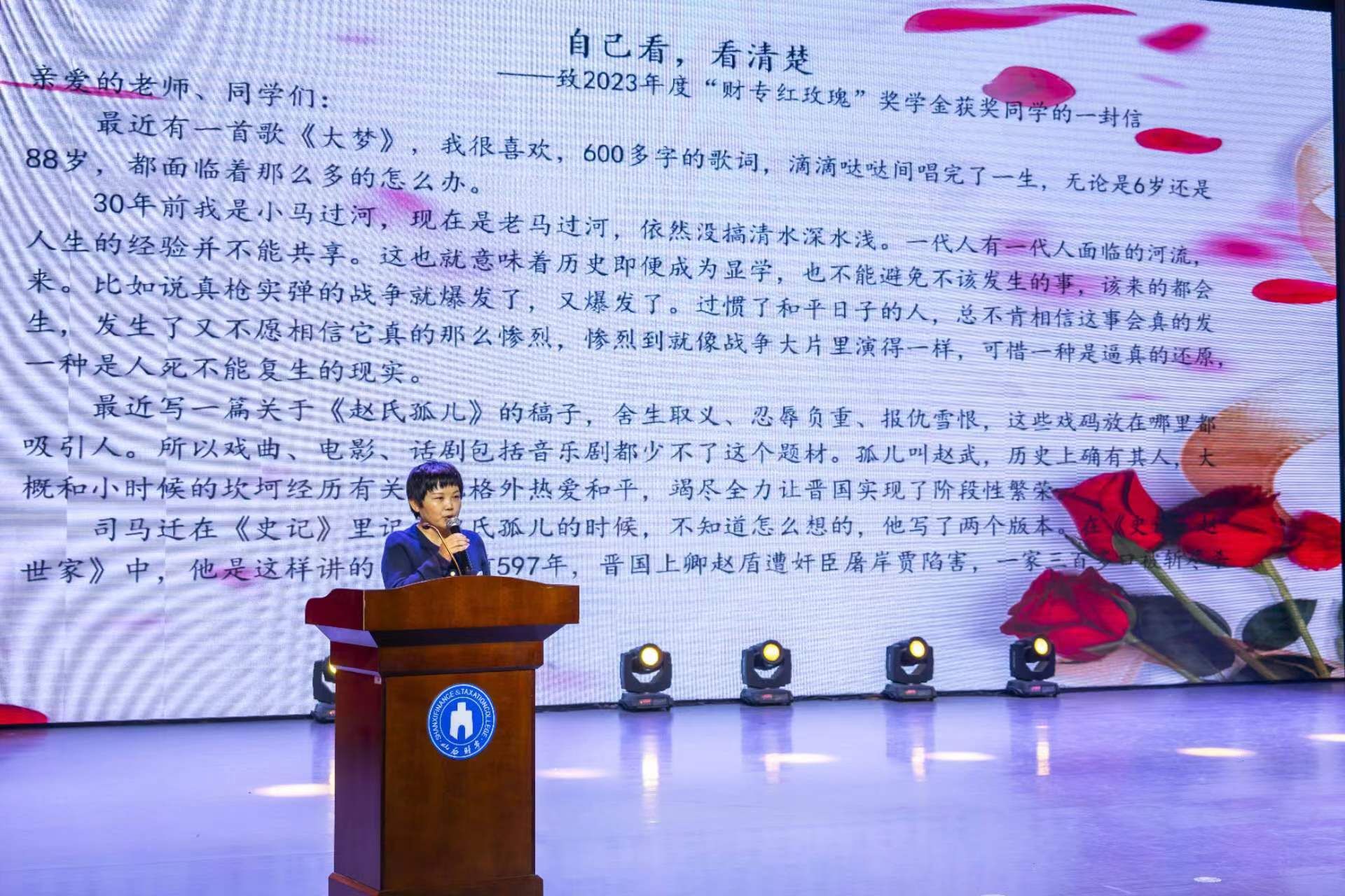 与会领导和千山万水公益基金会发起人、太原市税务局副局长师旭峰及校友代表为获奖同学们颁发2023年财专“红玫瑰”奖学金。马江歌校友宣读《致2023年度财专“红玫瑰”奖学金获奖同学的一封信》,传递着校友们浓浓的爱,殷殷的情,并祝红玫瑰、红蜡烛、红火炬精神代代传承。
