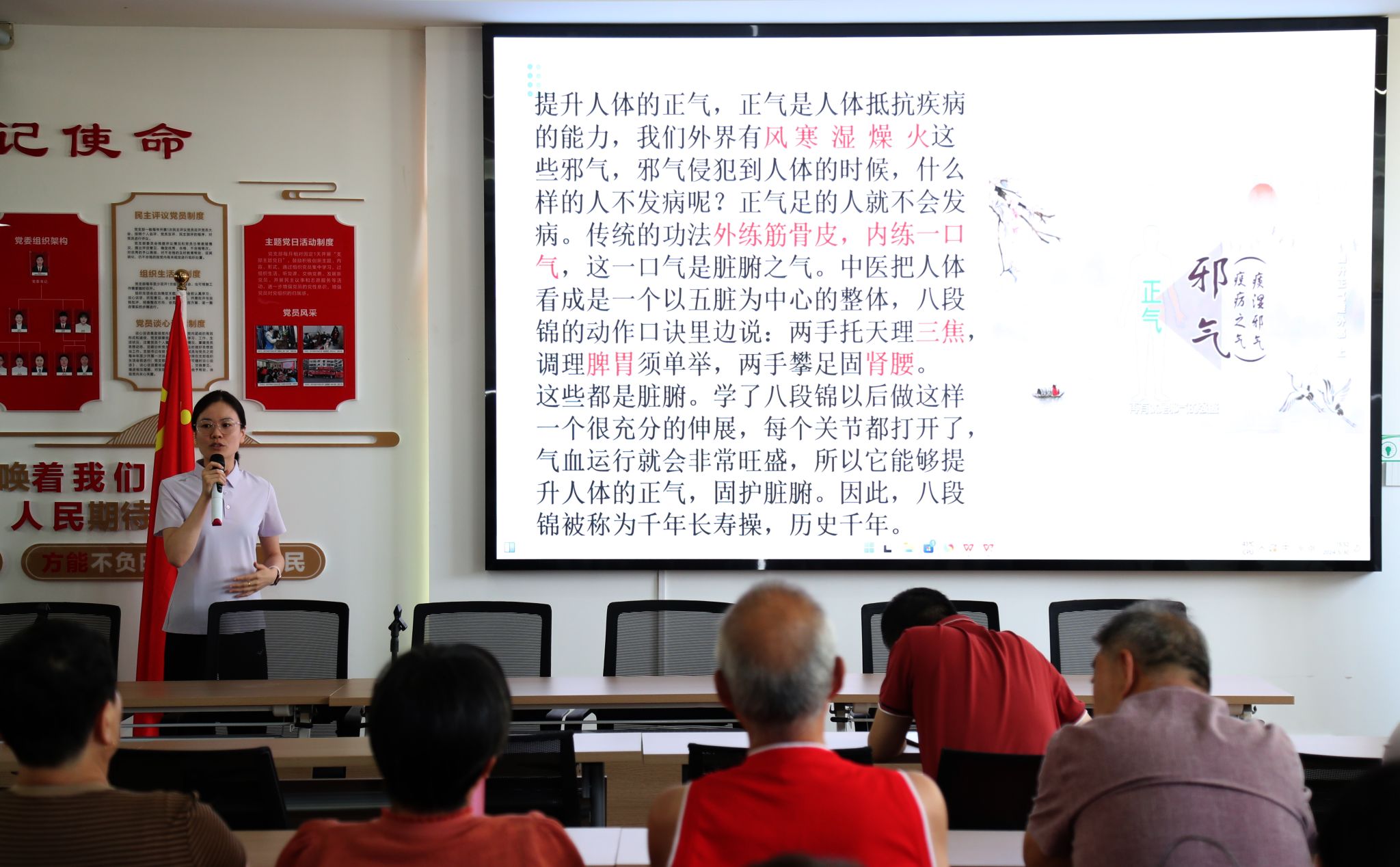 体育教学部王海燕、赵媛、武文静以示范教学方式,为大家带来了《科学养生八段锦》的现场教学。她们边讲解边示范,全体参会人员边学边练,现场气氛热烈而融洽。通过这一环节,大家不仅学到了实用的养生知识,还亲身感受到了八段锦的独特魅力,对科学养生有了更为直观和深刻的理解。